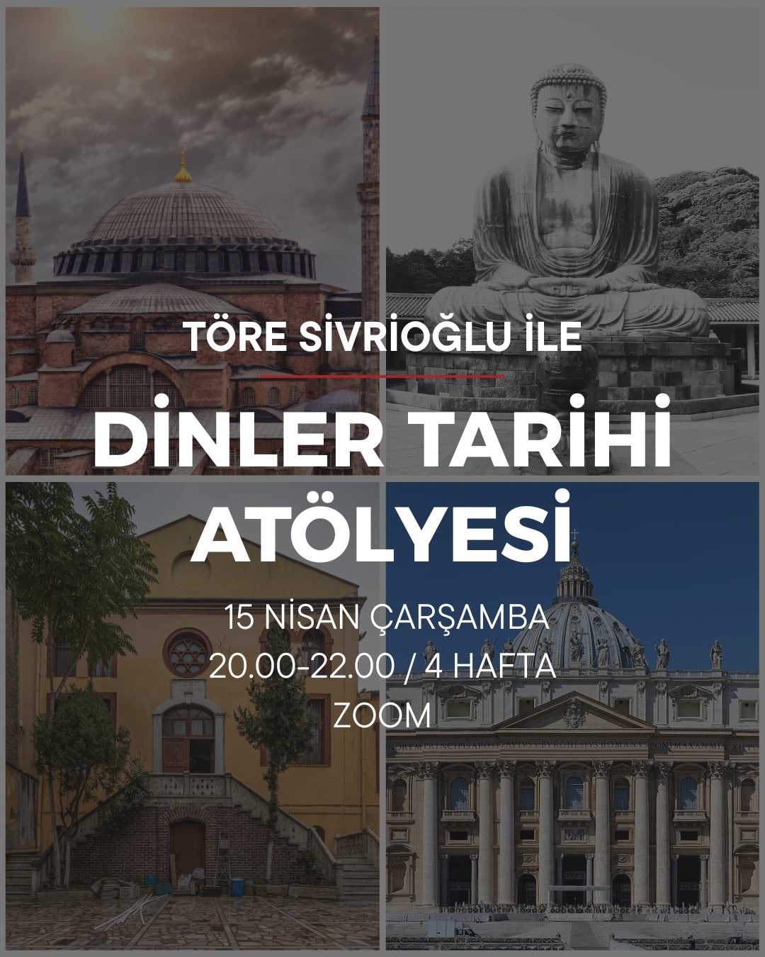 15 Nisan Çarşamba akşamı, saat: 20.00’de Töre Sivrioğlu ile Dinler Tarihi Atölyesi başlıyor! Hellen Tanrılarından başlayarak, paganizm, mezopatamya dinlerine, Hristiyanlık ve Nordik inançlara kadar tarihten bugüne dinleri en ince ayrıntısına kadar inceleyeceğiz.